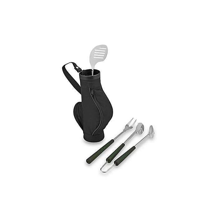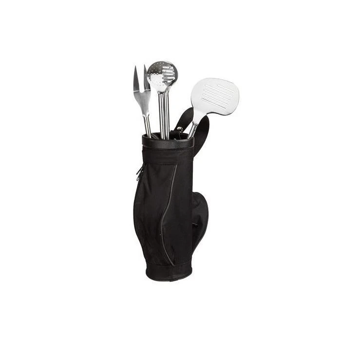 There’s a handy meat turner designed to look like a putter, a pokey fork, and a pair of tongs, each with a cute rubber golf club handle! They all fit into a golf caddie carry bag complete with two little zip pockets (for toothpicks and other doodads) and a shoulder strap so they’re easy to carry!