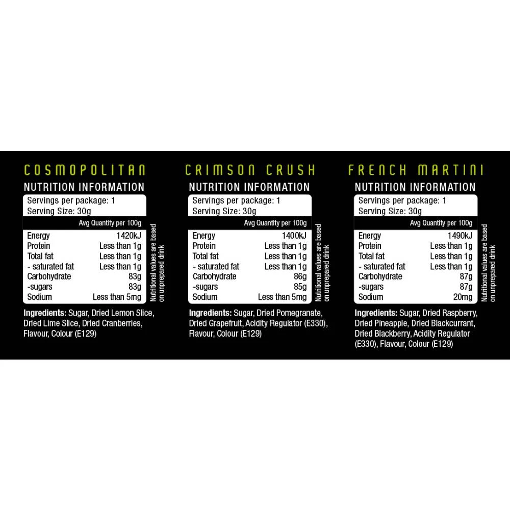 It includes a strainer and three bottles with the following flavours: Cosmopolitan, Crimson Crush and French Martini. This delectable set makes 3 x 200ml drinks – perfect to enjoy with friends for any occasion.