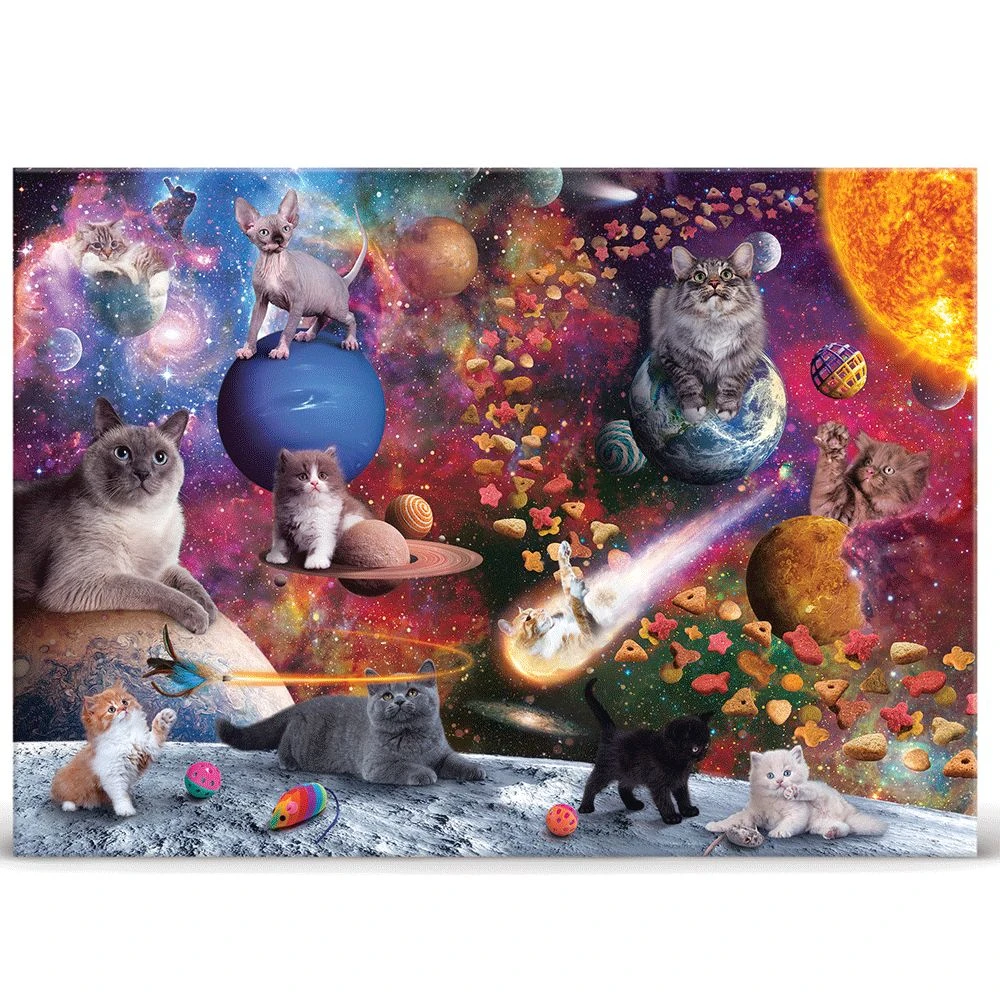 These cats have turned outer space into their own little playground, a galaxy of fun! There’s cat kibble floating through space and little toys waiting for them on one of the planets.