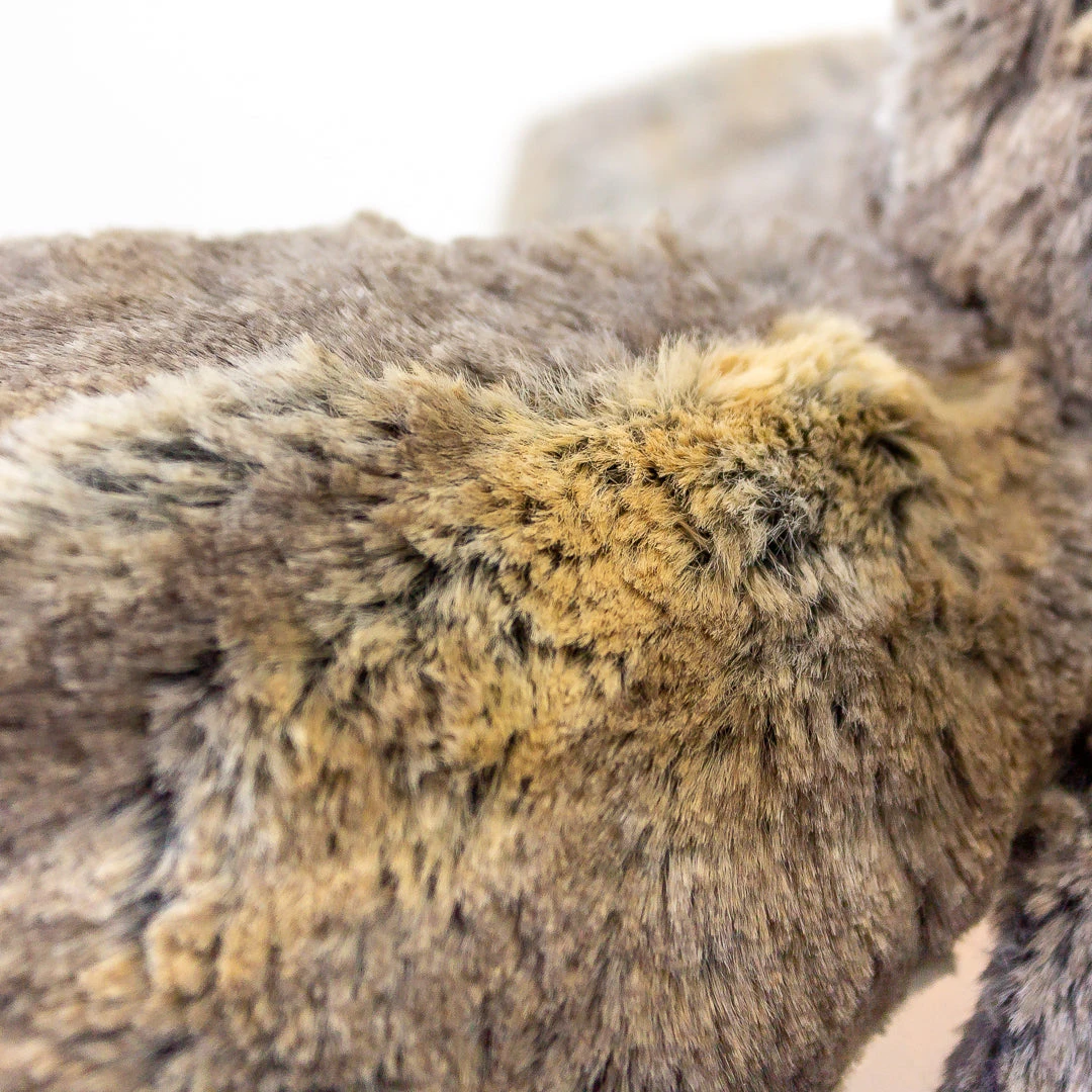 It’s a beautiful blend of natural colours, with shades of grey, brown and even the kind of warm orangey brown of a just-toasted marshmallow. Top it all off with a sweet pink nose and you’ve got an adorable companion for all your adventures!
