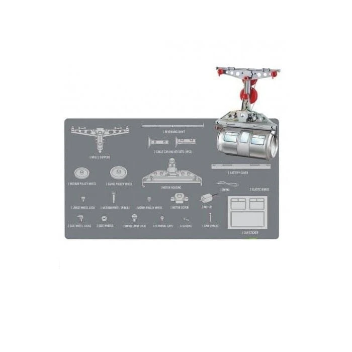 The kit includes everything to assemble your tin can cable car except for 2 x AAA batteries, a Phillips head screw driver and empty drinks can.
