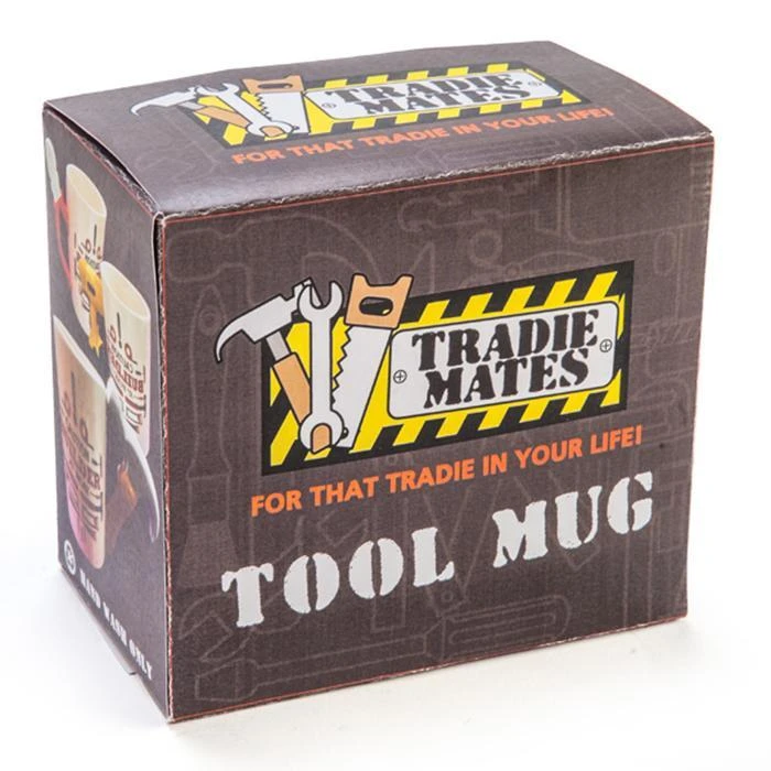 Hand-crafted from high quality ceramic and lovingly hand-painted to ensure each piece is unique, this mug features a cheeky 3D hammer handle, generous volume, the “Caution: Tradie At Work” warning on both sides of the mug, and iconography of various building related tools like paint rollers, saws, nails and tape measures in steel grey and fire engine red.