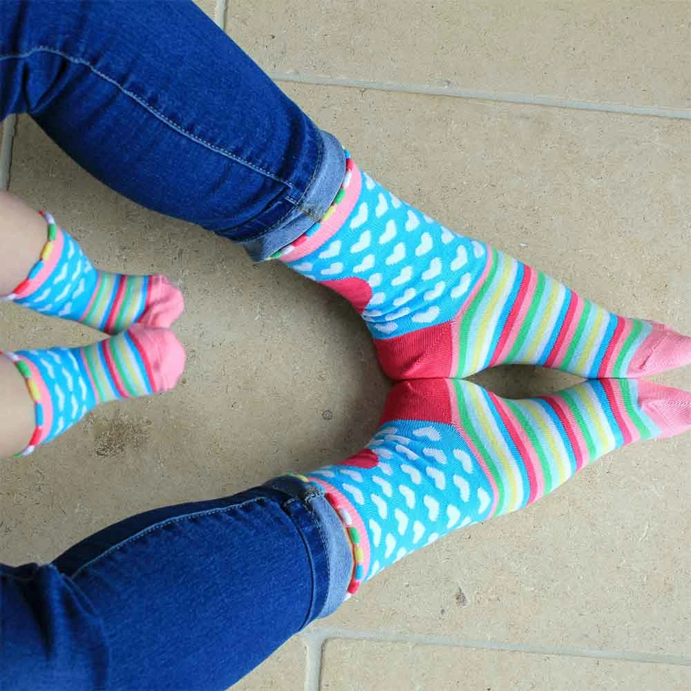 It comes with a pair of ladies socks (sizes 6-10 to suit most mums) and a matching pair for bubs (for ages 0-12 months). It’s got sweet love hearts, stripes and even a cute colourful bobble-style trim along the top.Â