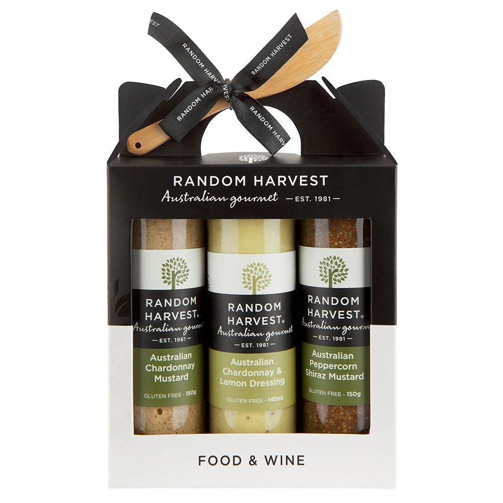 - Includes: Peppercorn Shiraz Mustard 150g, Chardonnay Mustard 150g, Chardonnay & Lemon Dressing 140ml, wooden spreader