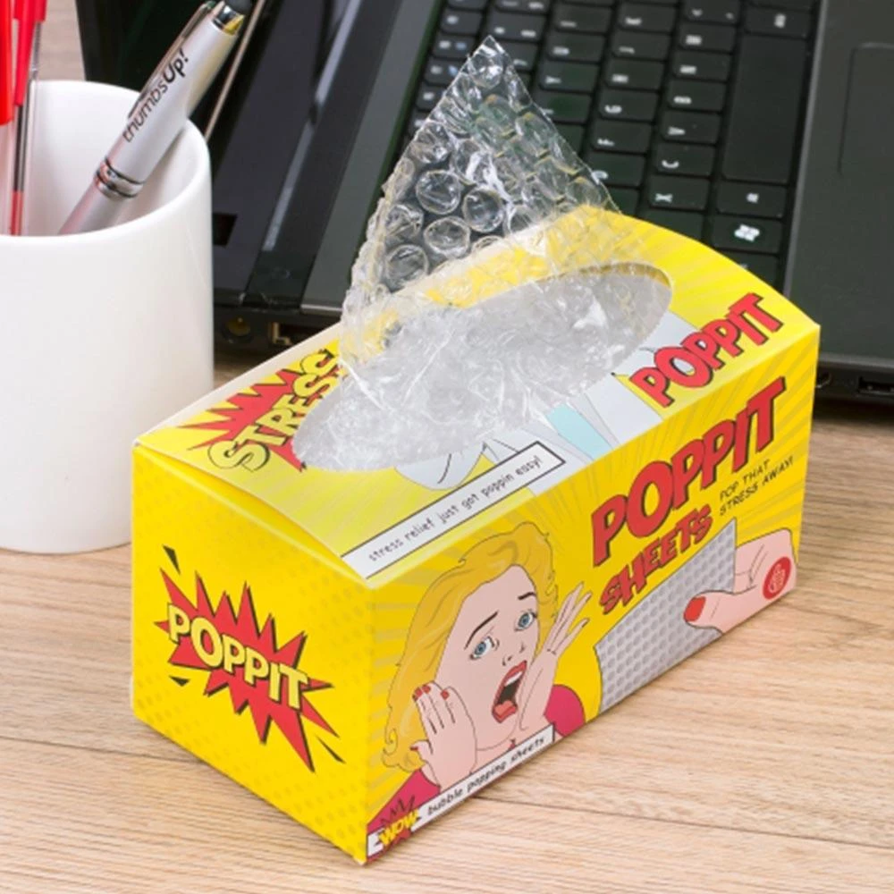 Poppit Sheets are tearable bubble wrap sheets conveniently packaged in a little cardboard dispenser box, ideal for placing on your desk, kitchen bench, in the car, or anywhere where one might find themselves in need of a little stress relief!