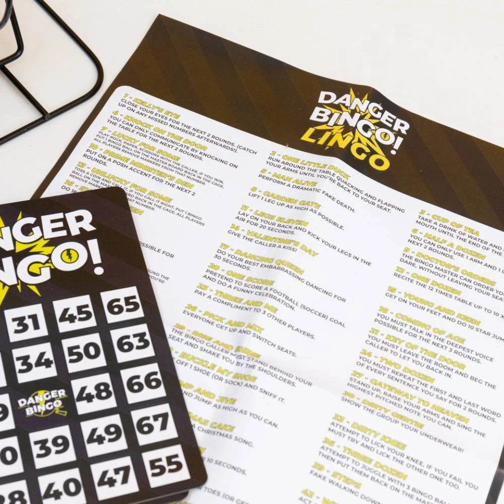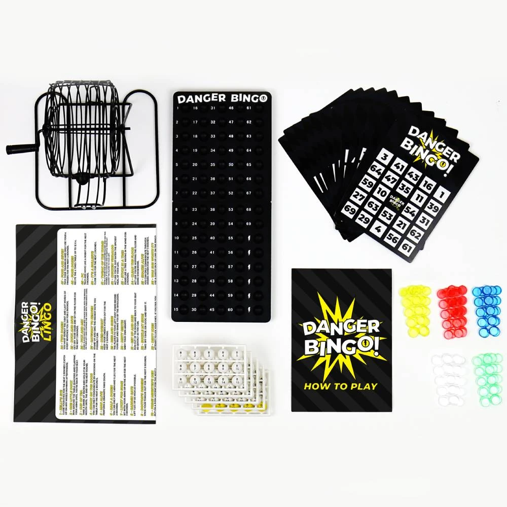 - Inclusions: 1 x Bingo Cage, 69 x Bingo Balls, 6 x Danger Balls, 150 x Bingo Markers, 12 x Danger Bingo Cards, 1 x Caller’s Board, 1 x Danger Bingo Lingo Sheet with 69 forfeits, 1 x Instructions