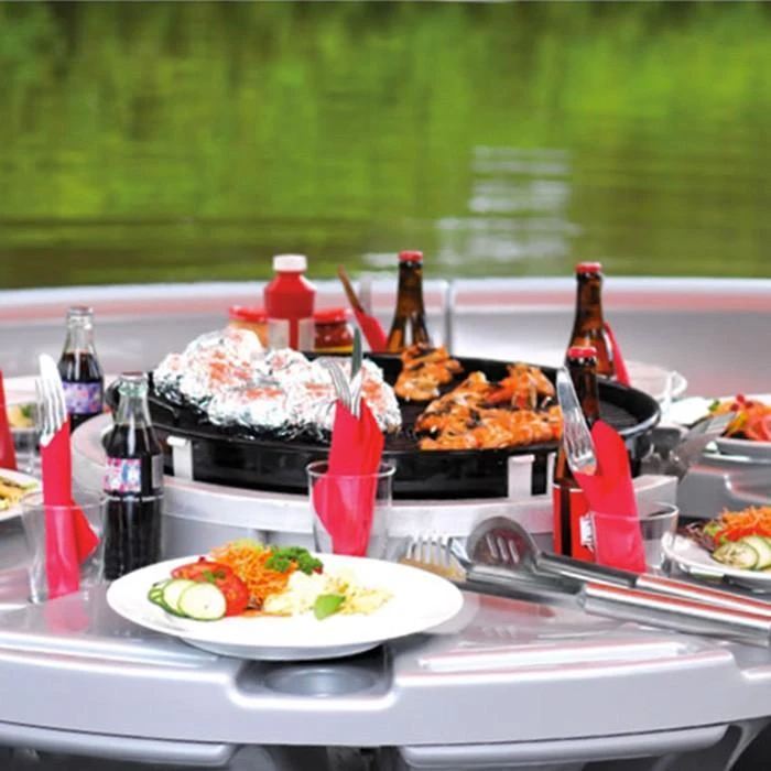 This is the boat with a built-in barbecue grill, umbrella, and trolling motor that provides waterborne cookouts for up to 10 adults. The boat’s 60cm-diameter steel charcoal grill is surrounded by an ABS table with 10 place settings that each have a recessed plate holder, three beverage holders, and silverware tray. Six compartments beneath the ABS seats store food and supplies for all-day cookouts. The 3.3m-diamter nylon umbrella can be retracted when using the grill. Its 30-watt electric trolling motor enables operators to maneuver up to 4 km/h through calm water and alongside docks for loading/unloading. The motor’s four rechargeable batteries provide up to eight hours of continuous use from a 10-hour charge. Polyethylene hull.
