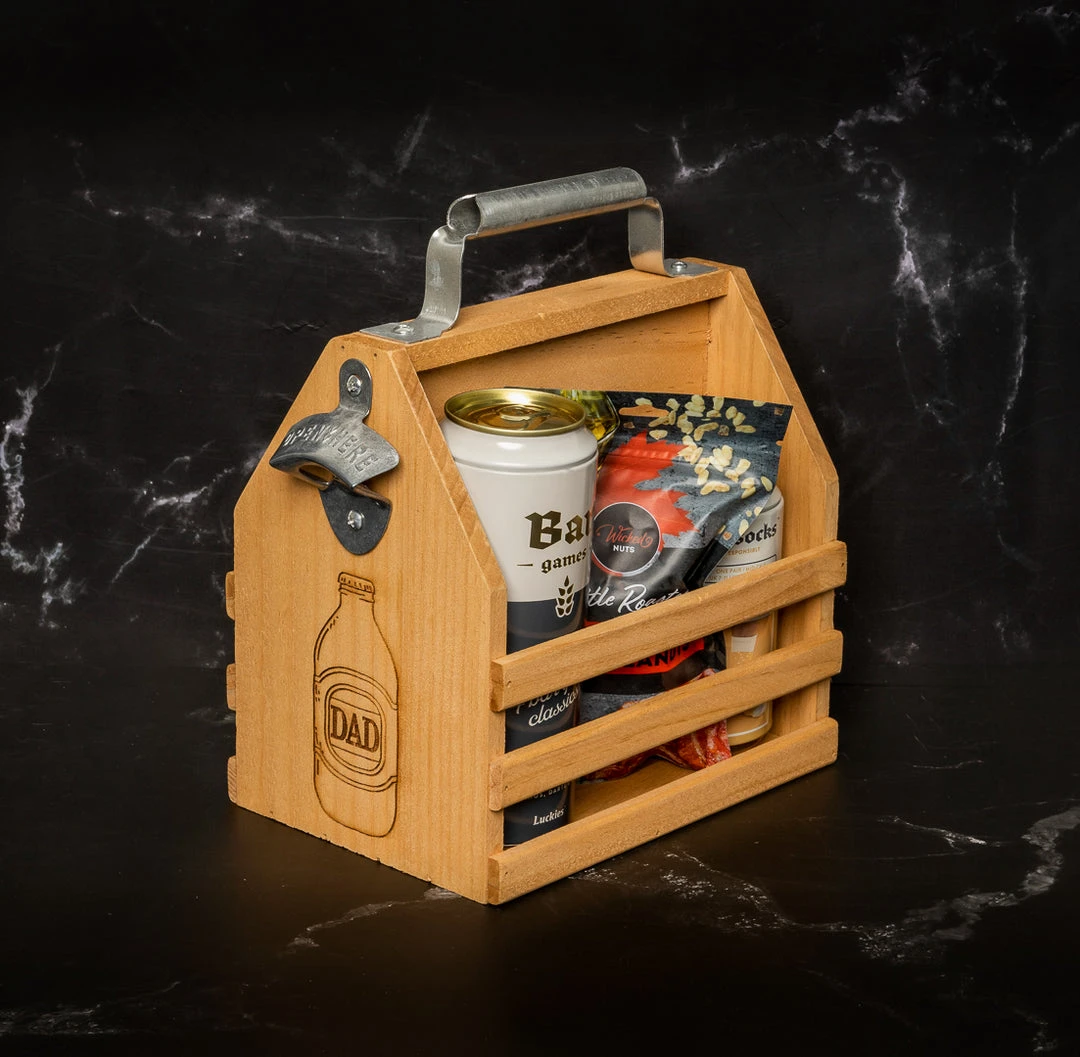 All these gifts come packaged in what is probably the best gift of all, a wooden beer caddy perfectly sized to fit six stubbies. It has a bottle opener built into the side and under that is an engraving in the style of a classic Aussie beer (for a hard earned thirst) and DAD on the label. Because he’s the true blue legend!