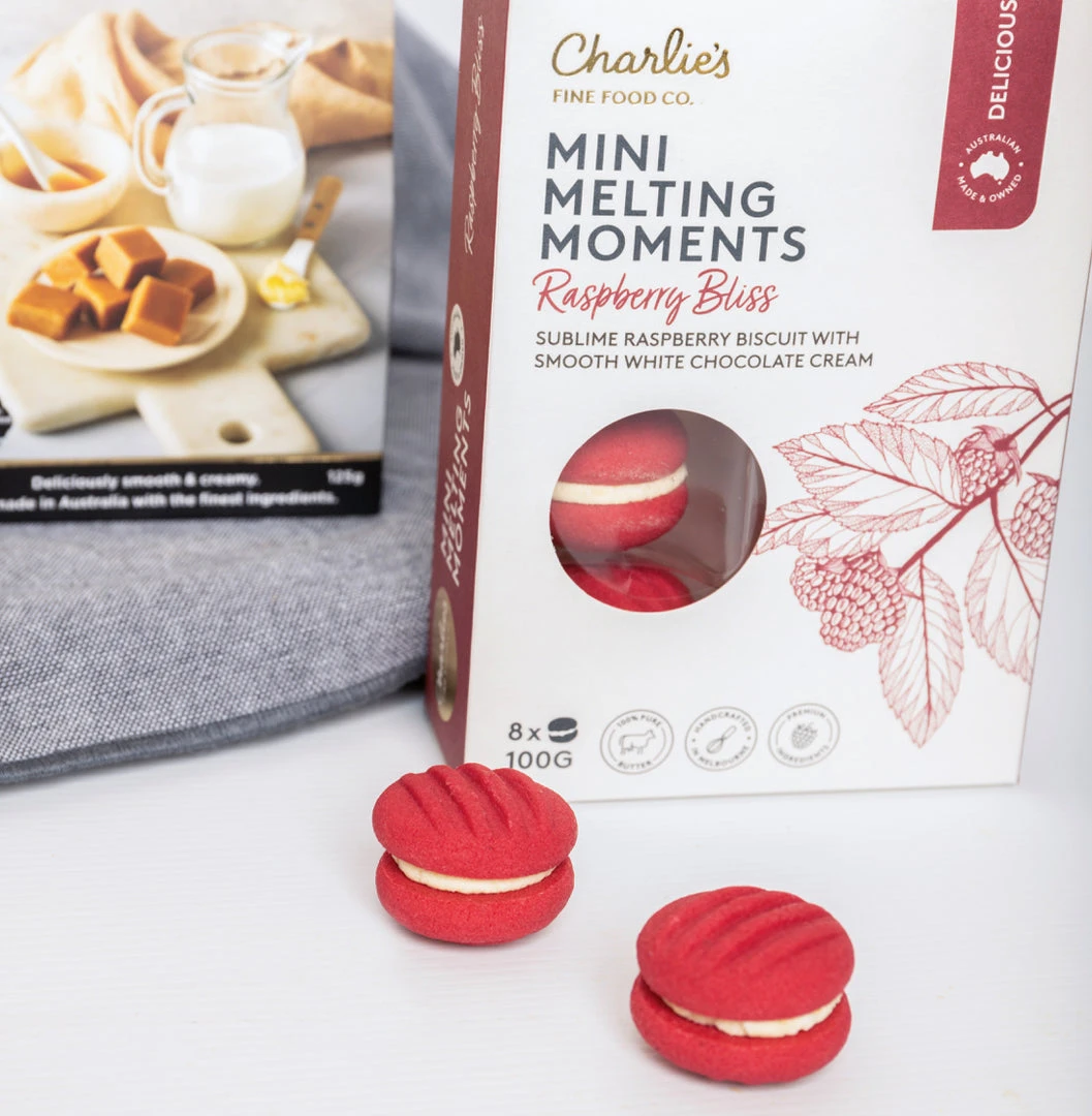 For a lighter sweet treat, you can go for the raspberry bliss mini melting moments, tiny morsels of pink magic. Or go the premium route with artisanal white chocolate and cranberry biscuits.