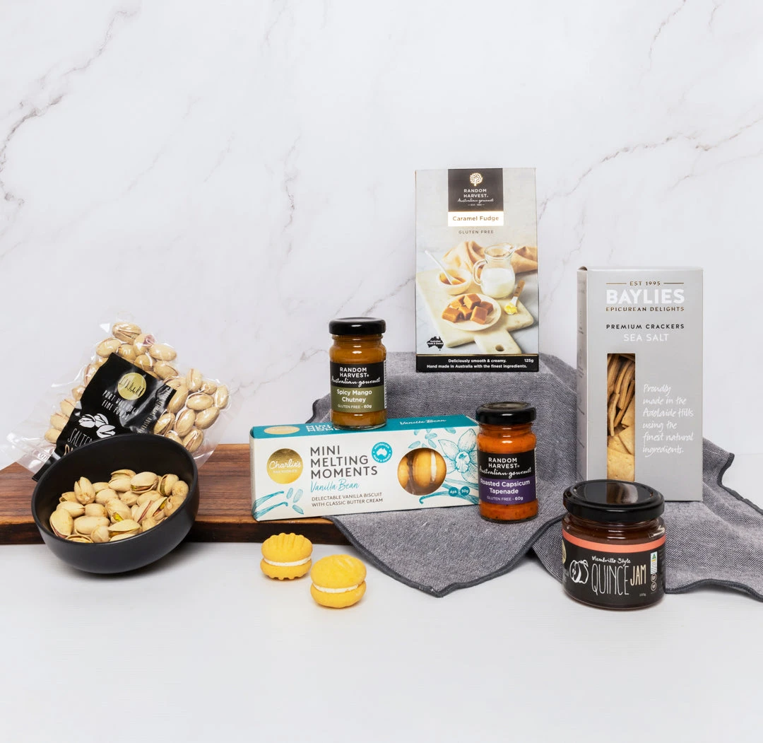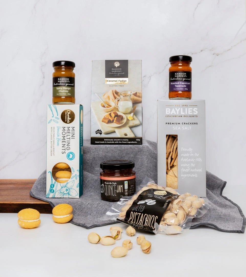 This is a collection of some of Australia’s finest snacks and sweets just for you. Create a masterful cheese and dip platter with premium sea salt crackers from Baylies, and moreish salted pistachio nuts.